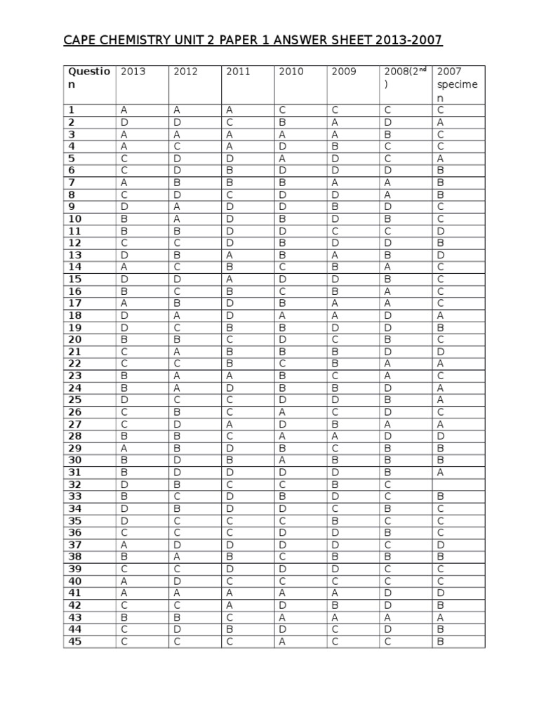 Cape Chemistry Unit 2 P1 Answer Sheet Pdf 42 C C A D B D B 43 B B C A A A A 44 C D B D C D B 45 C C C A C C B Cape Chemistry Unit 2 Paper 1 Answer Course Hero
